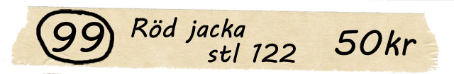 Du märker själv dina varor med ditt anmälningsnummer, typ av vara, storlek och pris. Ringa in ditt anmälningsnummer. Se exempel hur det ska se ut: